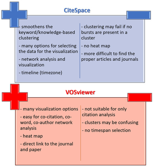 Both programs, CiteSpace and VOSviewer, have their advantages and drawbacks which are summarized in Figure 4.