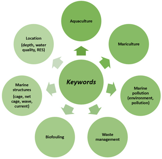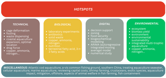 Hotspots are divided into four sections: technical, biological, digital, and environmental. Keywords are separated into these sections to show which parts of the production are studied the most and what they are related to. Figure 11 shows that, according to the keywords, the research focuses on the main categories—technical, biological, digital, and ecological. In terms of technology, many references deal with the construction of cages, forces, fouling, waste management, etc. The biological aspect is quite developed because for many years the main focus was on the organism itself (fish, shellfish, or others), which is why keywords are mostly related to diseases, viruses, or nutrition. Although specific focuses of publications can be found, all categories are interconnected and influence each other’s outcomes. A good example is digitalization itself, where a database is established with the help of technological procedures (for example, numerical study), and then artificial intelligence or machine learning is introduced for faster and more efficient progress. The ecological component brings together all mentioned categories and tries to find the optimal contribution of methods and viewpoints to achieve a responsive, ecologically acceptable, and economically beneficial mariculture.