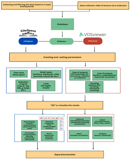 In this paper, the CiteSpace and VOSviewer platforms are used as complementary tools for greater field coverage. Data selection is primarily based on research topic and keywords, and distinguished by authors, journals, and countries. CiteSpace is well-known and used around the world to review articles [47]. The program has clarity and interpretability of visualizations and visual analytic capabilities [48] and can be used to detect landmarks, hotspots, developing trends, and important points in a series of publications [49]. Users can navigate and explore various patterns and trends discovered in scientific papers, developing a wider grasp of the scientific literature than an unguided search through the literature. VOSviewer can display a map in a variety of ways, each highlighting a distinct facet of the map. The programs’ viewing capabilities are notably beneficial for maps with at least a relatively significant number of elements (e.g., at least 100 items) [50]. The VOS mapping approach helps to lay out things on the maps and elements’ location will reflect their similarity [51].
