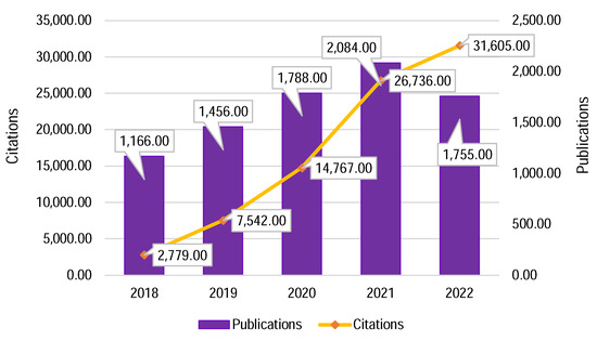 After analysis of technical problems and general research topics in mariculture, a visual representation of the results was made. Firstly, a citation report was performed, and as can be seen in Figure 7, publications related to mariculture in the period from 2017 to 2022 were analyzed together with citations. Publications reached a peak in 2021, and the number of citations in 2022 followed exponential growth. Figure 7 shows a growing interest in mariculture research, especially in 2020.