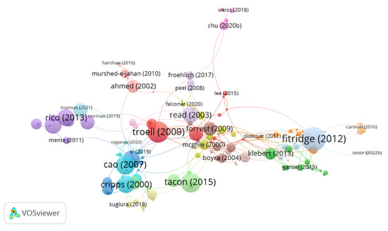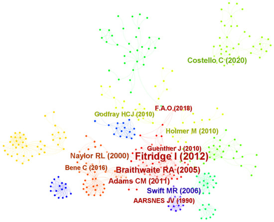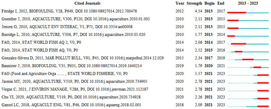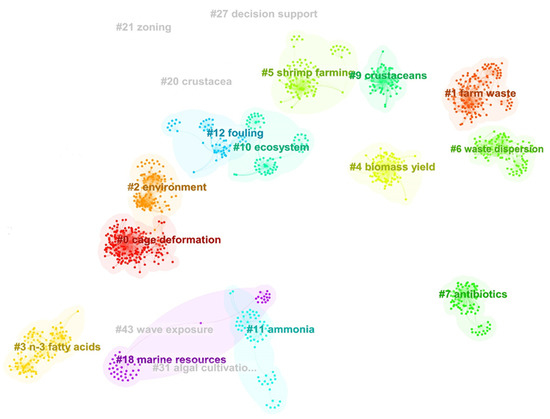 The same analysis was performed in CiteSpace as well, Figure 13, and based on the CiteSpace visualization the most cited paper is authored by Fitridge et al. [32] dealing with the impact and control of biofouling in mariculture. Related to the topic of biofouling, there are studies [37,86,87,88,89,90]. Food security and potential risks for mariculture were studied and most cited by Godfray et al. [91], Rosa [92], and Naylor et al. [93]. Cage, offshore mariculture, and how to make production more sustainable are discussed in [94,95,96].