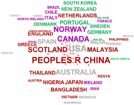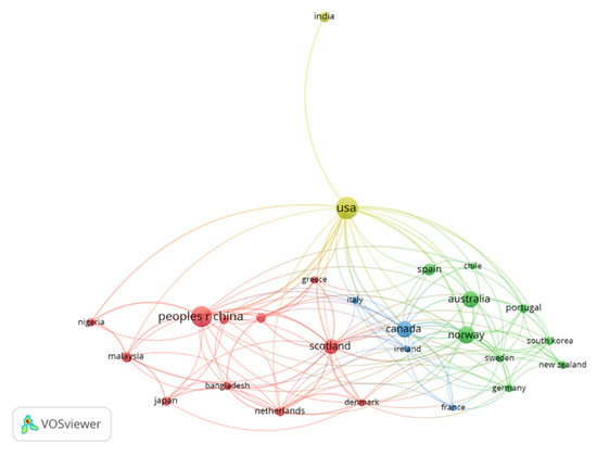 In Figure 14, countries with the most research in the field of aquaculture or mariculture are presented. European countries, authors from Norway and Sweden, have published most of the studies, but afterward, there are authors from Scotland, Germany, Netherlands, Portugal, Spain, and others.