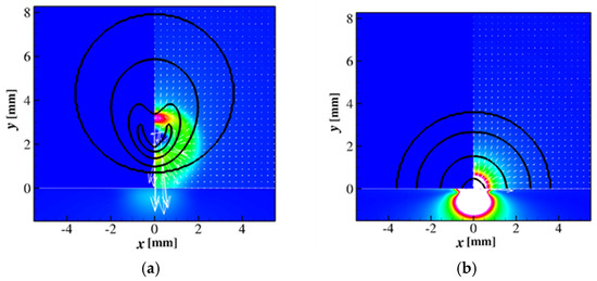 The collapse of a spherical cavitation bubble near a solid boundary in water was computed by Plesset and Chapman [26] (see Figure 1), and then the deformation of the bubble was experimentally observed using high-speed photography at a framing rate of 300,000 frames/s [27]. A microjet in a cavitation bubble was also clearly identified by Crum [28]. Microjets and shockwaves have been attractive phenomena for researchers and engineers and are important for understanding bubble dynamics [29] and sonochemistry [30]. The microjet in a cavitation bubble is still an attractive phenomenon for researchers [31,32,33,34]. As shown in Figure 1, the development of a microjet in a spherical cavitation bubble is an interesting phenomenon, and some researchers believe that the microjet during cavitation bubble collapse can be utilized for peening. It has been demonstrated numerically, using fluid/material-coupled numerical simulations, that the pressure produced by the collapse of a hemispherical bubble is much stronger than that of microjet-type collapse, as shown in Figure 2 [35]. In Figure 2, the black line shows the shape of the bubble changing with time, and the color contour reveals the pressure in the fluid and the equivalent stress in the material at bubble collapse. Although the microjet during the bubble collapse generates a pressure wave of ≈100 MPa, the collapse of the hemispherical bubble produces pressure waves several times larger than those of the microjet. Thus, a hemispherical bubble should be used for laser cavitation peening. Note that the pressure induced by a flattened bubble, i.e., a pancake-type bubble, or a longitudinal bubble is weaker than that of a hemispherical bubble [35].