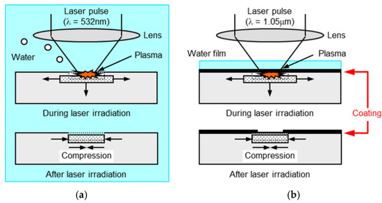 Fundamental process: (a) laser peening without coating (LPwC); (b) laser peening with coating (sacrificial overlay) [5].
