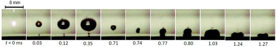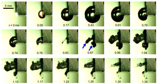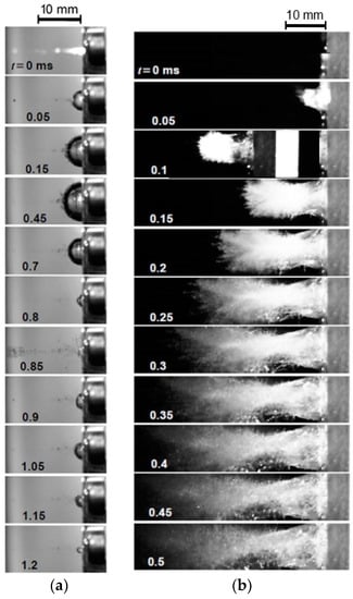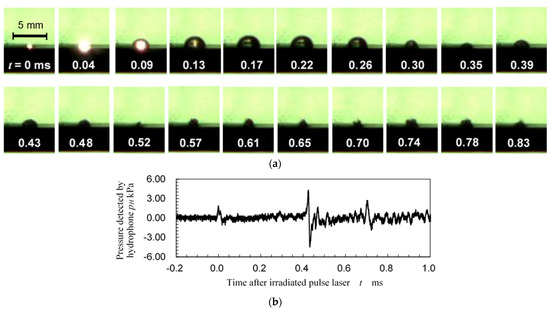 Next, we compare experimentally microjet-type bubbles, as shown in Figure 2a, and hemispherical bubbles, as shown in Figure 2b. Figure 15 shows the behavior of a bubble that was developed near the target surface by focusing on the water [58]. The bubble was initiated in the water near the target and developed, then collapsed in the water. After that, the bubble was developed on the target, then collapsed on the target.