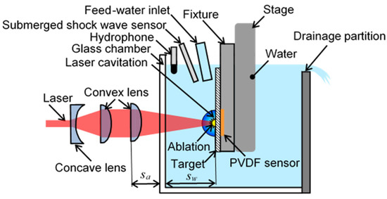 In order to illustrate laser cavitation peening systems, Figure 5 shows a schematic diagram of a laser cavitation peening test section. A target was placed in a water-filled glass chamber. A pulsed laser from a laser source was expanded using a concave lens, then focused on the target surface using a convex lens(es) to avoid damage to the glass of the chamber. The standoff distances in air sa and water sw were optimized by measuring the peening intensity with sa and sw. During conventional submerged laser peening, the second harmonic of an Nd:YAG laser, i.e., a wavelength of 532 nm, is used in order to avoid absorption in the water [5]. However, from the point of view of the generation of cavitation bubbles, the fundamental harmonic, i.e., 1064 nm, is more beneficial, since the heat is more concentrated; researchers who have investigated cavitation bubbles using pulsed lasers have used Nd:YAG lasers [38]. A total of 40% of the pulse energy at 1064 nm is lost to obtain 532 nm during wavelength conversion. It was reported that the laser cavitation induced by a 1064 nm pulsed laser introduced compressive residual stress into hard metals such as alloy tool steel, when the standoff distance in water was optimized [39]. Recently, a portable submerged laser peening system using a pulsed laser with a wavelength of 1064 nm was developed [40]. In order to measure the pressure and/or impact caused by the laser ablation and laser cavitation collapse, a submerged shockwave sensor, a hydrophone, and a PVDF sensor were used. As the cavitation impact energy can be obtained using an AE sensor and/or a laser Doppler vibrometer [41], these can be useful for measuring and/or monitoring the peening intensity of laser cavitation peening. During submerged laser peening, peening with and without a sacrificial overlay can be carried out. In both cases, as a number of small particles are produced during laser ablation, feeding with water is required to remove contamination. We discuss water quality later in this paper. Thus, the fundamental harmonic, i.e., a wavelength of 1064 nm, was used to generate laser cavitation during the additional experiment.