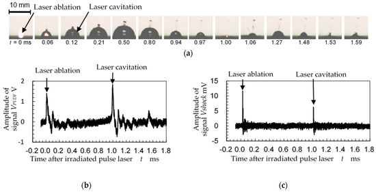 Laser ablation and laser cavitation produced by a pulsed laser: (a) images showing the development of laser ablation and laser cavitation; (b) signal from a PVDF sensor in the target; (c) signal from a shockwave sensor in water. Reprinted from [20] with permission from Elsevier, License Number 5532490964237.