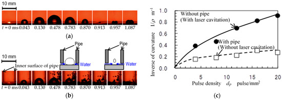 As a cavitation bubble collapse can be controlled by boundary conditions around the bubble, in one study, a pipe was placed near a target plate around the focus point and the arc height of the target plate was measured [43]. The arc height has been used for the measurement of the peening intensity [44,45]. The inverse of curvature can be calculated from the arc height, and it is proportional to the arc height [46]. In Figure 8a, the target plate without a pipe was peened using submerged laser peening; both the laser ablation impact and laser cavitation collapse were used in Figure 8a and without a pipe in Figure 8c. However, a pipe was placed near the target plate around the focus point and peened in Figure 8b. As shown in the schematic above Figure 8b, when the pipe was placed near the wall, the bubble moved upwards and collapsed in the water rather than on the target surface. Thus, the peening intensity, i.e., the inverse of the curvature with the pipe, was nearly half of that without the pipe, as only the laser ablation impact was used; the laser cavitation collapse impact was not used during the peening with the pipe. It can be concluded that both the laser ablation impact and laser cavitation collapse impact are used during conventional submerged laser peening, as one pulsed laser hits the surface twice. Regarding another important paper [47], during optimized laser cavitation peening, the laser cavitation collapse impact energy was 2.2 times larger than that of laser ablation.
