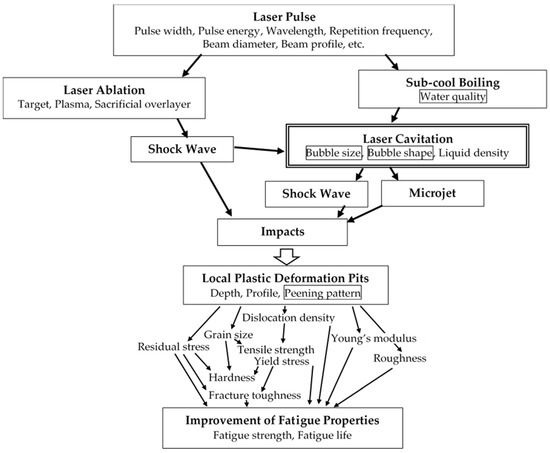 Figure 9 reveals an overview of the mechanisms and key factors of laser cavitation peening. When a laser pulse with a pulse width of several nanoseconds is irradiated to a target, laser ablation is generated, and laser ablation produces a shockwave; then, the shockwave initiates a bubble, i.e., laser cavitation. A laser pulse with a pulse width of several hundred microseconds also generates laser cavitation due to subcooled boiling [48,49]. In terms of the phase change phenomenon from the liquid phase to the gas phase, this is affected by the characteristics of the liquid. The effect of the liquid was investigated in a previous study using pure water, glycerol, liquid paraffin, and silicone oil, and it was reported that the highest stress was observed in water [50]. The shockwave and the microjet of the laser cavitation produce the impacts, as well as the shockwave induced by the laser ablation. These impacts produce local plastic deformation pits on metallic materials. The local plastic deformation pits change the material properties, such as the residual stress, hardness, yield stress, tensile strength, dislocation density, grain size, Young’s modulus, roughness, fracture toughness, etc. The compressive residual stress and the work-hardening introduced by laser cavitation peening can improve fatigue strength and fatigue life. It has been reported that laser cavitation peening reduces crack initiation and crack propagation [51].