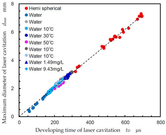 As a larger bubble produces a larger impact during cavitation bubble collapse [52,53,54,55], the most important factor of laser cavitation peening is the bubble size. In order to demonstrate the monitoring of bubble size, Figure 10 shows the relationship between the developing time, tD, and the diameter of laser cavitation, dmax [16]. In Figure 10, the red circles show the data with respect to the hemispherical bubble and the other circles indicate the spherical bubble. tD is defined as the time from laser ablation to the first collapse of the laser cavitation. For example, this was approximately 1 ms in the case of Figure 6. The dmax was evaluated using a high-speed video camera (see Figure 6a). Figure 10 was obtained by changing the laser pulse energy. As shown in Figure 10, dmax [mm] is proportional to tD [µs] and the relation is described in Equation (1), including both spherical and hemispherical bubbles [16].