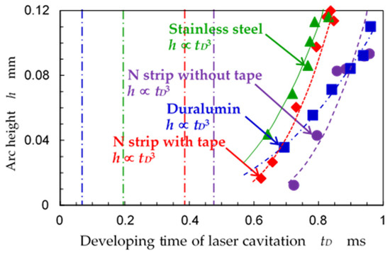 In order to reveal the relation between bubble size and peening intensity, Figure 11 shows the relation between the developing time, tD, and the arc height, h [16]. As shown in Equation (1), the bubble size can be estimated using tD. As mentioned in the explanation of Figure 8, the peening intensity can be evaluated using the arc height. In Figure 11, duralumin, stainless steel, and N-strip were used; duralumin is a soft metal and N-strip is a hard material compared with stainless steel. Thus, the threshold impact, which corresponds to the material hardness, was assumed. When the threshold impact was assumed, the arc height was proportional to the maximum volume of the laser cavitation [16]. This is reasonable, as the cavitation intensity is proportional to the volume [52,53,54,55].