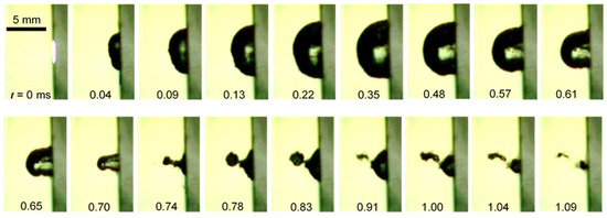 In this section, we investigate the effect of the bubble shape. Figure 12 shows images of laser cavitation. In Figure 12, the specimen was set closer than the optimal sw in Figure 5. When sw was large enough, the laser cavitation developed as a hemispherical bubble, as shown in Figure 6a. However, when sw was shorter than the optimal sw, the bubble developed into a flattened hemispherical bubble, i.e., a pancake-shaped bubble, t = 0.04–0.22 ms, as shown in Figure 12. During the shrinking of the bubble, it became a longitudinal bubble, as shown at t = 0.70 ms, and then collapsed.