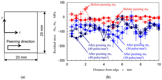 Introduction of compressive residual stress via laser cavitation peening to surface near edge of titanium alloy Ti6Al4V: (a) peening direction and definition of residual stress; (b) residual stress changing with distance from edge before and after peening.