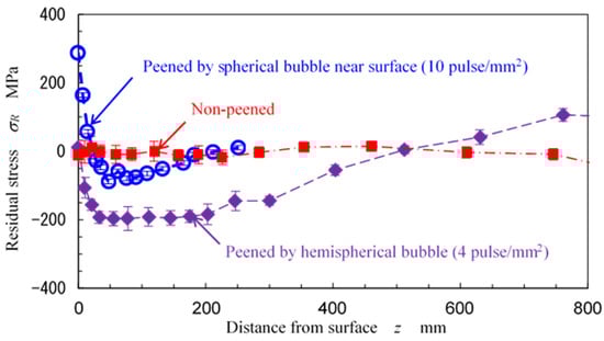 In order to compare the peening intensity of the bubble shown in Figure 15 and the hemispherical bubble, Figure 16 illustrates the residual stress as a function of the distance from the target surface. The blue line shows the residual stress of stainless steel treated at 10 pulse/mm2 by the bubble shown in Figure 15 [59], and the violet line shows treatment at 4 pulse/mm2 by the hemispherical bubble [6]. The red line reveals the residual stress without peening [59]. For both treatments, a Q-switched Nd:YAG laser of 0.35 J and 1064 nm was used. As shown in Figure 16, the hemispherical bubble at 4 pulse/mm2 introduced large compressive residual stress into a deeper region compared with the bubble shown in Figure 15 at 10 pulse/mm2. Namely, the collapse of the hemispherical bubble produced a more intense impact compared with the microjet.
