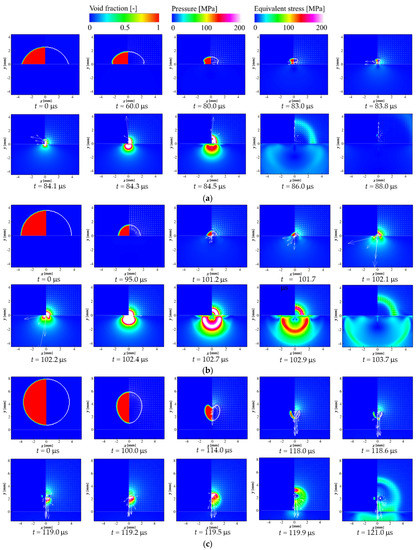 (a) γ = −0.3 corresponds to a pancake-shaped bubble, as shown in Figure 12; (b) γ = 0 corresponds to a hemispherical bubble, as shown in Figure 6a; and (c) γ = 1.2 shows the bubble near the wall, as shown in Figure 15. In the case of (c) γ = 1.2, the bubble has collapsed, generating a microjet. Iga and Sasaki simulated the void fraction, pressure in water, and equivalent stress of the material at various values of γ [35]. Three colored bars, one for each value, are shown in the upper part of Figure 17. Figure 17 reveals the contours of the values, changing with time. As shown in Figure 17a, regarding γ = −0.3, the pancake-shaped bubble, part of the bubble near the wall shrunk quicker than the top of the bubble; it became a longitudinal bubble at t = 83.8 µs. The longitudinal shape was very similar to the longitudinal bubble at t = 0.70 ms in Figure 12. t = 0 ms in Figure 12 corresponds to the irradiation of the pulsed laser.