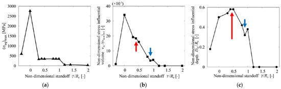 In order to consider the effect of bubble shape on peening and/or erosion via cavitation bubble collapse, Figure 18 shows variations in the maximum equivalent stress and stress influence area changing with γ. The maximum equivalent stress had a maximum at γ = 0. Namely, the impact caused by the hemispherical bubble, γ = 0, was larger than that of the microjet-mode bubble γ = 1.2. Further, the stress influential volume has a maximum at γ = 0, and the hemispherical bubble collapse affects the wider volume compared with microjet-type collapse, as shown in Figure 18b. Note that the collapse of the bubble at γ = 0.5 affects a deeper region compared with the bubble at γ = 0. Considering the results of Figure 18a–c, the collapse of the hemispherical bubble at γ = 0 is suitable for laser cavitation peening.