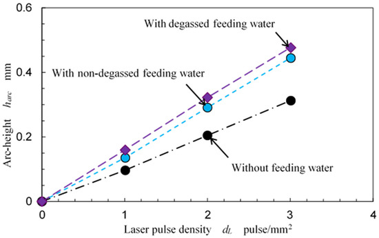 In order to investigate the effect of feeding water on peening intensity, Figure 19 shows the arc height changing with the laser pulse density at various conditions using an aluminum plate. During the present condition, the flow rate of the feeding water was 5 L/min. The oxygen content was 6.4 mg/L without degassing and 1.6 mg/L with degassing. The water temperature was about 283 K. As shown in Figure 19, the arc height of laser cavitation peening with feeding water was larger than that of the peening without feeding water, as the feeding water removed small particles that were caused by laser ablation. The small particles might obstruct the laser from reaching the target surface. If the air content in the water was large, the minimum size of the cavitation bubble was larger. Thus, the rebound after the cavitation bubble collapse was slightly slower, and the impact during bubble collapse was reduced. This is called the “cushion effect”. The cavitation bubble collapse impact is affected by the air content of the water. As shown in Figure 19, the arc height of laser cavitation peening with degassed feeding water was larger than that of non-degassed feeding water. Thus, in order to minimize the cushion effect, feeding with degassed water is suitable for laser cavitation peening.