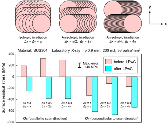 In order to reveal the effect of the peening pattern, Figure 20 shows the surface residual stress changing with the irradiation step in the x- and y-directions, as shown in the upper part of Figure 20. The interval “a” is for 36 pulse/mm2 during isotropic irradiation. For all three cases, similar compressive residual stress was introduced, even though anisotropic irradiation was applied. Note that the virgin surface was treated.