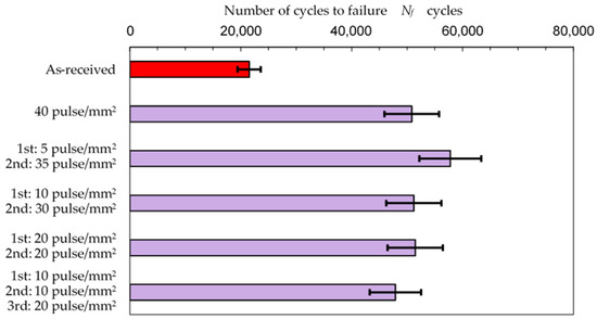 In order to investigate the effects of overstrike during laser cavitation peening, Figure 21 reveals the fatigue life of titanium alloy Ti6Al4V manufactured via direct metal laser sintering. The fatigue life was evaluated using a torsion fatigue tester [60]. For all five cases, the total laser pulse density was 40 pulse/mm2. In the case of 40 pulse/mm2, both the step distance in the circumferential direction and axial direction was 0.158 mm. In the case of 5 + 35 pulse/mm2, the step distances in both the circumferential and axial directions were 0.447 mm at the first step and 0.169 mm at the second step. For all five cases, the fatigue life was improved compared with the as-built specimen. The first 5 pulse/mm2 and the second 35 pulse/mm2 had the longest life. When Ti6Al4V was treated via laser cavitation peening, the surface was oxidized. It was reported that the oxidized layer of Ti6Al4V after laser cavitation peening was Ti4O5 [10]. As the color of Ti4O5 is black, the irradiated laser energy was more intense compared with the treatment of the virgin surface, which is blighter than Ti4O5. The local surface residual stress changed in between laser spots [57]; the higher the laser density at the last stage of laser cavitation peening, the longer the fatigue life.