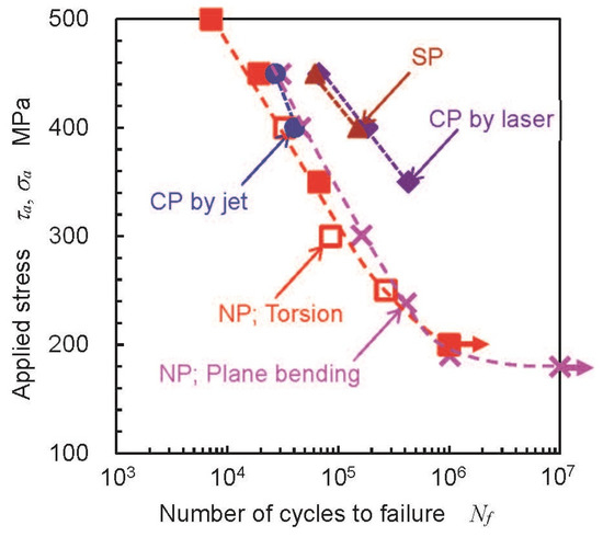 In order to reveal the improvement of the fatigue properties of 3D metals via laser cavitation peening, Figure 22 shows the S–N curves of additive-manufactured titanium alloy Ti6Al4V via direct metal laser sintering (DMLS) treated using laser cavitation peening compared with a non-peened (as-built) specimen [60], as 3D metals are attractive materials [61]. As shown in Figure 22, the fatigue life was improved by laser cavitation peening (CP by laser).