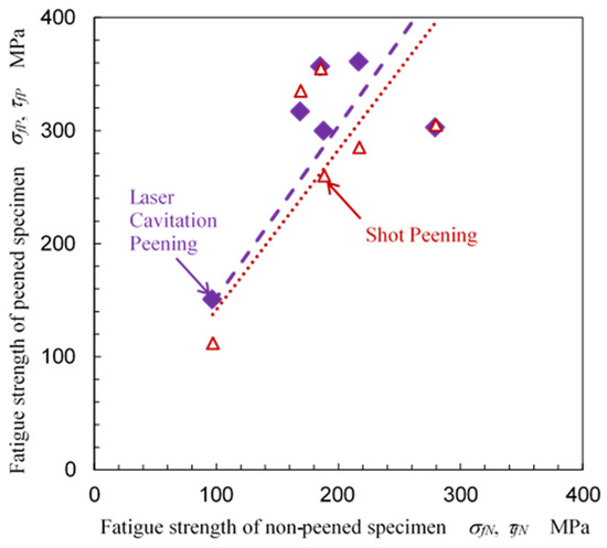 Table 1 shows the fatigue strength at 107 of non-peened metallic materials and materials that underwent laser cavitation peening compared with shot peening. The fatigue strength at 107 was calculated using Little’s method [62]. Figure 24 illustrates the relationship between the fatigue strength of the non-peened specimen, σfN, τfN, and the fatigue strength of the peened specimen, σfP, τfP. As shown in Table 1 and Figure 24, both laser cavitation peening and shot peening improve the fatigue strength compared with the non-peened specimen. When the proportional constant is considered, laser cavitation peening and shot peening can be described as in Equations (5) and (6).