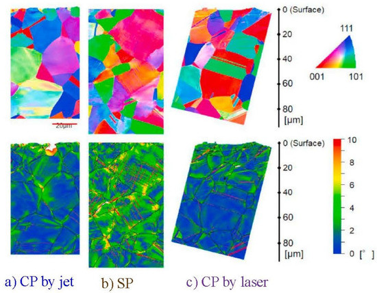 In order to consider the difference in the improvement of fatigue strength between laser cavitation peening and shot peening, Figure 25 reveals an EBSD analysis of the cross-section after (a) cavitation peening, CP, using a cavitating jet; (b) shot peening, SP; and (c) cavitation peening using a laser, i.e., laser cavitation peening [63]. During the experiment, the stainless-steel plate was treated so that the arc height was equivalent in all three cases.