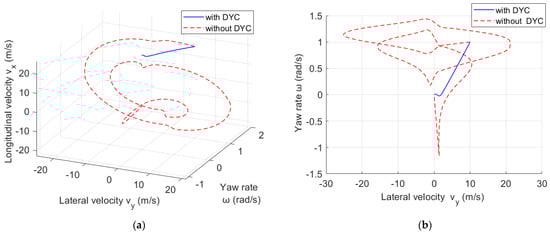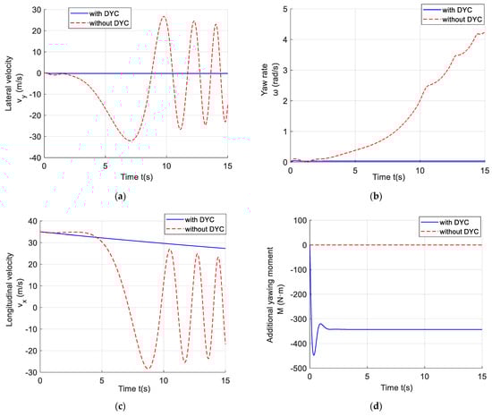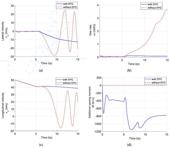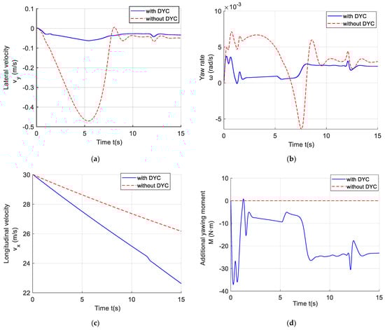 In order to analyze the dynamic characteristics of the 5DOF vehicle system model with DYC, specific driving conditions are selected for the simulation. The initial conditions of the simulation are longitudinal velocity = 25 m/s, lateral velocity = 10 m/s, and yaw rate = 1 rad/s. The simulations with and without DYC control are carried out, respectively.