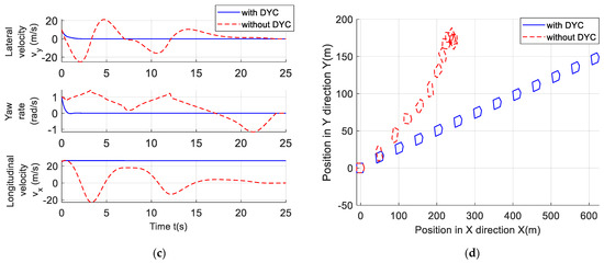 Figure 1 shows the comparison diagrams of the phase space trajectory, state variable time series, and body attitude of the vehicle system with or without DYC control under the above simulation conditions, respectively. It can be seen that without DYC control, the longitudinal velocity, lateral velocity, and yaw rate of the vehicle have larger fluctuations, and the vehicle body rotates, resulting in vehicle instability. On the contrary, in a vehicle with DYC control, the range of phase trajectory changes is small, and the lateral velocity and yaw rate are infinitely close to a non-zero constant, allowing the vehicle to drive stably. Figure 1d shows the driving status of the vehicle. It should be noted that due to the control effect of DYC, the longitudinal velocity is reduced by braking. However, there is no significant decrease in the longitudinal velocity. This is because a large portion of lateral kinetic energy and yaw kinetic energy converted into longitudinal kinetic energy in a short period of time. Therefore, even with braking interference, changes in the longitudinal velocity are insiginficant.