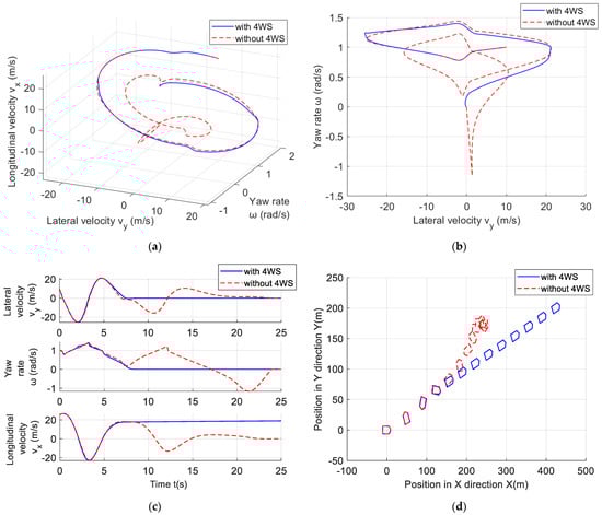 The dynamic characteristic diagrams with or without 4WS (four−wheel steering) control: (a) Phase space trajectory; (b) projection of phase space trajectory on plane; (c) system state variables; and (d) vehicle operation attitudes.