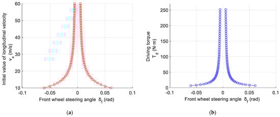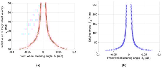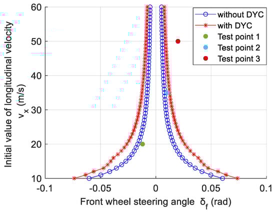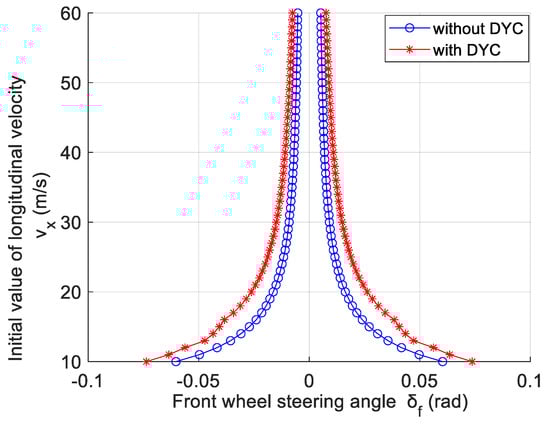 Figure 5 compares the differences between the driving stability regions with and without DYC. When the initial longitudinal velocity is the same, and the longitudinal velocity is 10 m/s, the range of the front wheel steering angle with DYC control is from −0.0737 rad to 0.0737 rad, which is larger than the range without DYC control (from −0.0603 rad to 0.0603 rad). When the initial longitudinal speed is 15 m/s, the difference between the extreme values of the front wheel steering angle is the largest, and the DYC control effect is the best. When the initial longitudinal velocity is between 10 m/s and 30 m/s, the expansion of the driving stability region is particularly significant. At this time, the vehicle has a larger steering range, which means it is more stable. When the initial longitudinal velocity is larger than 30 m/s, the driving stability region of the vehicle with DYC still shows an expanding trend, which also means that DYC control still has an effect on improving vehicle stability when driving at high speeds.