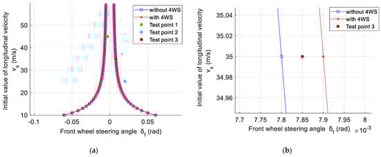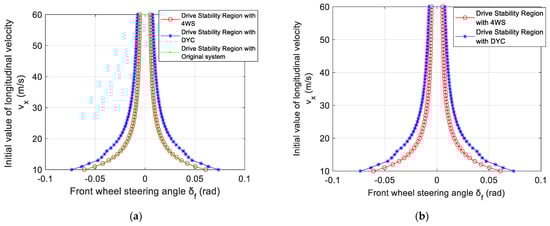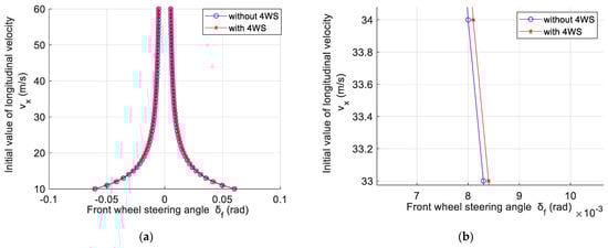 Figure 7 shows the differences between the driving stability region of the vehicle system with and without 4WS. Figure 7b is a partially enlarged view. From the results of the driving stability region with or without 4WS, it can be seen that although the driving stability region with 4WS is not as effective as DYC, the driving stability region is still larger than before. It is evident that by comparing the bifurcation point data in Table 4, when the initial longitudinal velocity is between 10 m/s and 30 m/s, the expansion of the driving stability region is the greatest. When the initial longitudinal velocity is greater than 30 m/s, the expansion of the driving stability velocity slows down. The simulation results show that the effect of 4WS is still effective.