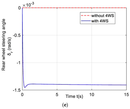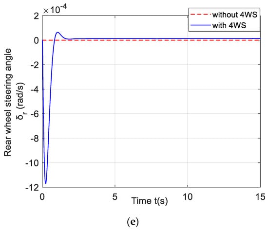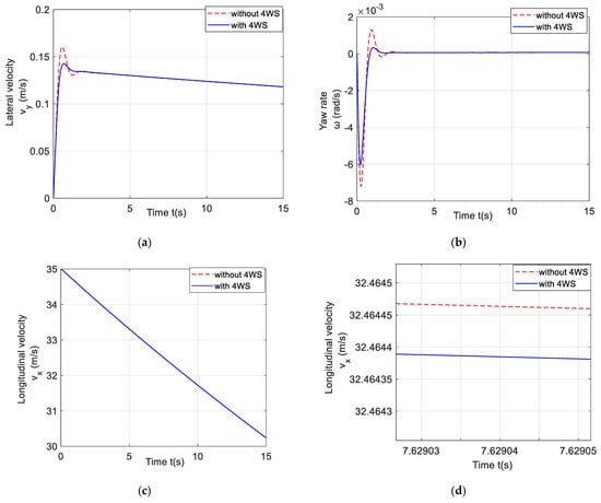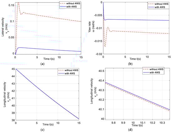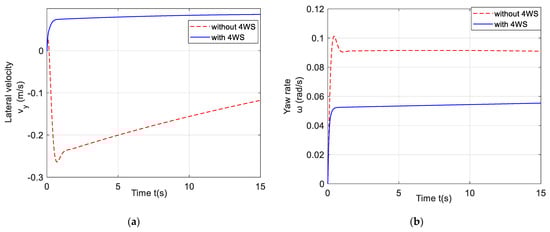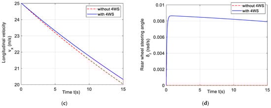 In order to analyze the changes in the dynamic characteristics of the nonlinear vehicle system model under 4WS control, the specific simulation conditions are selected. The initial conditions are the longitudinal velocity = 25 m/s, lateral velocity = 10 m/s, and yaw rate = 1 rad/s. The simulations with and without 4WS control are carried out, respectively.