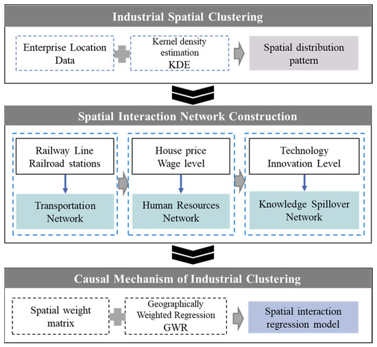 In recent years, the number of enterprises has grown massively and become the main driving force of the city’s economic development [1,2] and promote the normal operation of cities [3]. Due to economic conditions, geographical factors such as talent, technology, and policy regulations, enterprises gather and form scale effects within a regional scope, and they have positive or negative impacts on the surrounding areas. This spatial pattern phenomenon exhibited in geographical space is called industrial clusters [4].