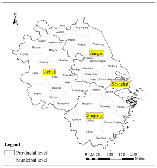 Based on the definition of the Yangtze River Delta Regional (Figure 2) Integrated Development Plan [49] issued in December 2019, this study selects the Yangtze River Delta region (including Shanghai, Jiangsu, Zhejiang, and Anhui provinces) with the largest concentration of foreign population in China as the study area. The Yangtze River Delta region is also located at the intersection of ‘One Belt, One Road’ and the Yangtze River Economic Belt. Therefore, domestic industries and foreign investment are found here in large numbers, and it is one of the regions with rapid economic development in China, and this place plays an important leading role in the development of the Yangtze River Economic Belt.