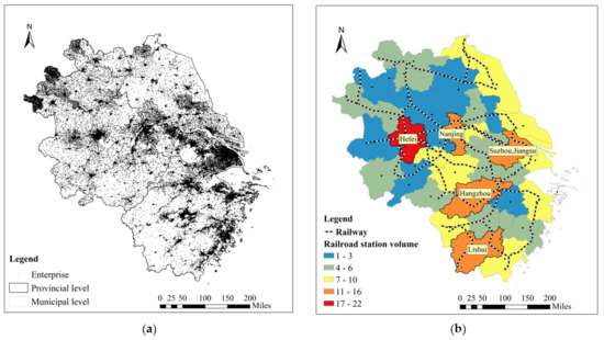 (a) Data on enterprises in the Yangtze River Delta. (b) Number of urban railroad stations and railway line data.