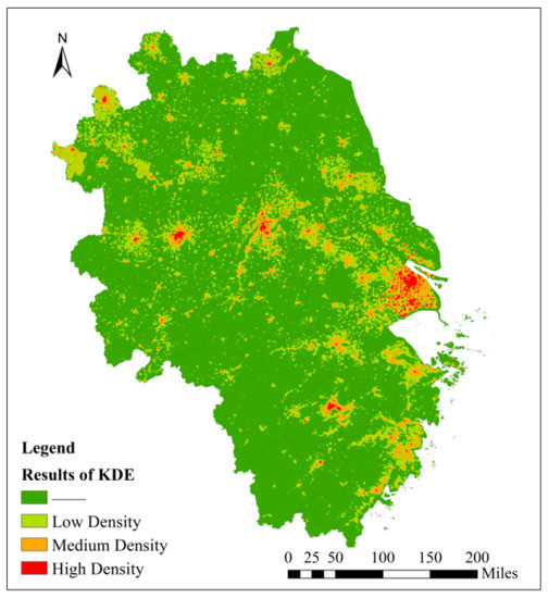 In the physical space, the area where a small number of enterprises gather cannot be designated as an industrial gathering area, so the scope identification of industrial gathering areas needs to exclude the area where a small number of enterprises are distributed. However, the clustering method may misjudge the area where a small number of enterprises are distributed as an industrial agglomeration area, and the misjudgment leads to inaccurate regional identification. At the same time, the aggregation intensity and other related index methods cannot show the spatial distribution pattern of industrial agglomeration. Therefore, this paper selects the kernel density analysis method based on smoothing, which highlights the regions with high industrial density aggregation and can obtain the local regional industrial aggregation density values as follows: