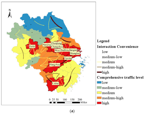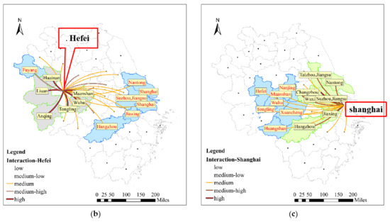 Figure 5a shows that the cities with a strong level of comprehensive traffic interaction are divided into two main lines: one is Shanghai–Suzhou–Wuxi–Changzhou–Zhenjiang-Nanjing and the other is Shanghai–Jiaxing–Hangzhou. Among the inland cities, Hefei has the strongest comprehensive traffic interaction level capability. In terms of the traffic interaction level between Hefei and the surrounding cities, Figure 5b shows that the traffic accessibility level between Hefei and the neighboring regional cities, such as Huainan, Liuan, Anqing, Tongling, Wuhu, and Maanshan, is relatively high. The connection is also strong between Hefei and distant regions, such as Shanghai, Hangzhou, Nantong, and Jiaxing etc., and these cities are mainly located in the eastern region. The close connection between Shanghai and its surrounding areas and Hefei City provides the basis for other information interactions. Among the eastern cities, Shanghai’s leading position cannot be ignored (Figure 5c). The results show that Shanghai not only has strong traffic connection levels with neighboring regional cities, such as Suzhou, Jiaxing, and Huzhou, but the convenience of the railway line also makes it possible for Shanghai to have relatively convenient traffic interactions with distant cities, such as Xuancheng, Huangshan, Hangzhou, and Hefei, etc. Due to its relative location and the fact that the railway line is not directly planned, Nantong does not have the strongest level of transportation links with Shanghai.