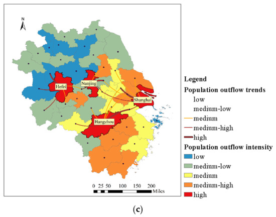 The study shows that cities have both population inflow and outflow trends; therefore, in this article, the results are split as shown in Figure 6b,c. In terms of comprehensive population outflow trends, four major cities, namely Shanghai, Nanjing, Hangzhou, and Hefei, have prominent outflow trends: Shanghai mainly flows to Suzhou, Jiaxing, Wuxi, and Changzhou; Hangzhou mainly flows to Jiaxing and Huangshan; Nanjing mainly flows to Zhenjiang, Changzhou, and Maanshan; and Hefei mainly flows to Huainan, Liuan, Anqing. In terms of the comprehensive population inflow trends, Suzhou, Wuxi, Quzhou, Xuancheng, Liuan, Huainan, Zhenjiang, and Maanshan have the largest relative inflow trend, and these cities are mainly located around the cities with large outflow trends.