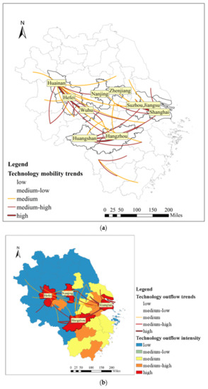 Figure 7a shows the urban technology innovation flow trend network. In addition, the figure shows that high-level technology innovation flow is mainly located in the neighboring regions of provincial capital cities, such as Shanghai–Suzhou, Nanjing–Zhenjiang, Hangzhou–Huangshan, and Huainan–Hefei–Wuhu.