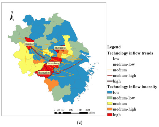 The study shows both technology innovation inflow and outflow trends in cities; therefore, the results are split in this article, as shown in Figure 7b,c. Shanghai, Hefei, Nanjing, and Hangzhou have the strongest integrated outflow trends and mainly flow to neighboring cities, with Shanghai mainly flowing to Jiaxing, Suzhou, Wuxi, Zhenjiang, Changzhou, and Huangshan; Nanjing mainly flowing to Zhenjiang, Hangzhou mainly flowing to Huangshan; Hefei mainly flowing to Anqing and Huainan; and Hangzhou mainly flowing to Huangshan. The four major cities have a strong driving effect on the surrounding areas; for example, Shanghai, which plays the leading role, has the widest radius range. In terms of the comprehensive inflow trend of technological innovation, Zhenjiang, Huainan, Huangshan, and Xuancheng cities have the strongest comprehensive inflow trend; the input source of Huainan is mainly Hefei, the input source of Zhenjiang is mainly Nanjing and Shanghai, the main input source of Huangshan are Shanghai and Hangzhou, and the main input city of Xuancheng is Hangzhou. Each city has an important technological input to Xuancheng; however, the difference in intensity is not obvious.
