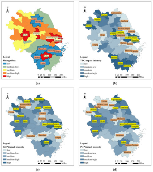 - Figure 8d shows that the cities with great influence of human resources on industrial agglomeration intensity are mainly Shanghai, Suzhou, Hefei, Yancheng, Jinhua, Lu’an and Anqing. Therefore, there has been a huge demand for a labor force in these cities, and a possible reason is the lack of local labor resources. These cities can attract and concentrate a large number of human resources through government decision-making and the migration of labor resources is realized by means of inter-city communication. The effect of ‘borrowing’ can help realize the vigorous development of the labor force industry. However, the level of human resources has relatively less influence on industrial gathering in Nanjing, Hangzhou, Suzhou, and Fuyang.