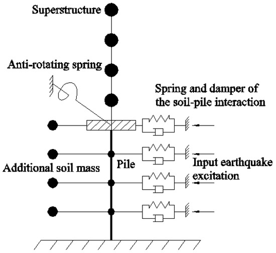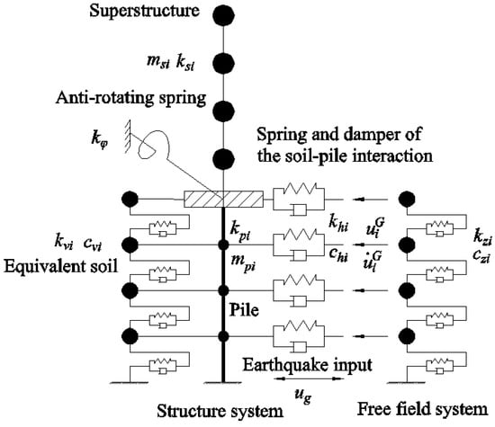 The Penzien model is composed of the superstructure, pile, and equivalent soil, as shown in Figure 1 [51]. The soil is divided into different layers according to its properties, and the masses of the soil layers are concentrated at the interfaces of each soil layer. The model simplifies the superstructure and piles into a series-wound multi-mass system. All piles are combined into one pile, and an equivalent rotational spring is added to the pile head to replace the anti-rotational stiffness of the original pile foundation. The pile foundation is divided into several elements according to the soil layers. The mass of the pile is concentrated at the interface of each horizontal soil layer. The effect of additional soil mass is simulated by the additional mass directly connected to the pile. The interaction between the soil and pile is represented by the horizontal springs and dampers of the soil–pile interaction. The horizontal ground motion displacement of each layer of the free field is input at the other end of the horizontal spring and damper.