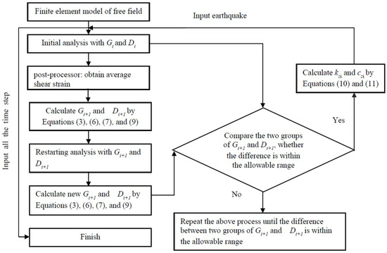 Ge et al. [68] used the finite element model of a shaking table test to verify the accuracy of the Davidenkov foundation model used in the ANSYS software to simulate the dynamic nonlinearity of soil. The results of the shaking table test were in good agreement with those of the numerical model. Therefore, the Davidenkov model used in this paper is well-proven. The calculation formulas of the stiffness and damping of the soil in the improved Penzien model can be obtained by substituting the calculation results from ANSYS into Equations (10) and (11). Thus, the dynamic nonlinearity simulation of soil is realized in the improved Penzien model. The calculation process of the soil dynamic nonlinearity is as follows: firstly, the initial dynamic shear modulus Gi and the initial damping ratio Di are substituted for the initial analysis. Enter the post-processor and the average shear strain of soil is calculated. The dynamic shear modulus Gi+1 and the initial damping ratio Di+1 are then calculated using Equations (3), (6), (7), and (9), which are the relationship equations between the dynamic shear modulus and shear strain, and between the damping ratio and shear strain. Thirdly, the dynamic shear modulus Gi+1 and damping ratio Di+1 are used for the restarting analysis based on the previous analysis. Another dynamic shear modulus and damping ratio are calculated again through Equations (3), (6), (7), and (9). The two groups of the dynamic shear modulus and the damping ratio are compared with each other until the differences between the two rounds of before-and-after calculations are within the permissible values. Fourthly, the average dynamic shear model and damping ratio of each soil layer in this time step are obtained, and the stiffness and damping of each soil layer in the Penzien model are then calculated using Equations (10) and (11). The iteration step stops and the following step then starts, repeating the above calculation process until the earthquake input is completed. The calculation flowchart is shown in Figure 3.