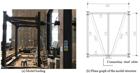 The superstructure was a 6-story steel frame structure. The first floor was used as the experimental substructure, and the other floors and the soil were the numerical substructures. The test model was a frame structure with a design ratio of 1:1, and the test model was a single-story, single-span, single-truss structure. The story height of the structure was 2.6 m, and the spans in both horizontal directions were 2 m. The columns of this model were made from wide flange hot rolled H-section steel with a height of 150 mm, a width of 150 mm, a web thickness of 7 mm, and a flange thickness of 10 mm. The beams were I-section steel with the dimensions 140 mm × 88 mm × 6 mm. The lap steels of each layer were equilateral angle steels with the dimension of 90 mm × 10 mm. The superstructure was made of Q235 steel with a yield strength of 235 MPa and an elastic modulus of 2.06 × 105 MPa. The schematic diagram of the model is shown in Figure 4.