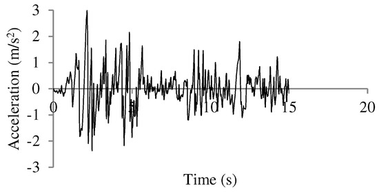 The connection between the actuator and the test steel frame model was located in the middle of the main beam. The test system consisted of the reaction wall, the hydraulic servo loading system, the test model, the displacement sensor, and the MTS793 control system. The actuator was produced by an MTS company in the United States, with an ultimate thrust of 250 KN, a horizontal range of 250 mm, a force accuracy of 0.01 KN, and a displacement accuracy of 0.01 mm. The input motion selected was the El-central earthquake, whose peak acceleration was adjusted to 0.1 g and 0.2 g according to the seismic code [72] corresponding to the seismic fortification intensity of 6 degrees and 7 degrees, respectively. The first 15 s wave of the El-central earthquake including peak acceleration value was selected for a total of 750 steps, and the time step was 0.02 s. The acceleration history of the El-central earthquake is shown in Figure 5.