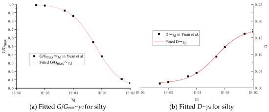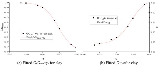 The site soil has strong nonlinear properties, and the dynamic nonlinearity of the site soil was simulated using an equivalent linear model first presented by Seed [61,62]. The soil in the model is a viscoelastic medium, and the equivalent shear modulus G and equivalent damping ratio D are used to express the basic characteristics of the relationship between dynamic stress and dynamic strain. G and D are expressed as functions of the dynamic strain. Hardin and Drnevich [63] improved the soil model through experiments and first presented the empirical relationship in the prediction Gd/Gmax~γd, the Hardin–Drnevich model. The equations are shown in Equations (3)–(5).
