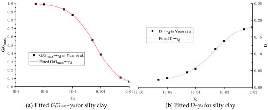 Gd, Gmax, γd, and γr denote the dynamic shear modulus, maximum dynamic shear modulus, dynamic shear strain, and reference shear strain, respectively. Gmax is determined according to Equation (6). When γd is large enough, the ultimate value of the soil shear strength as the asymptotic line is taken as τmax. In general, τmax is the value when γd is 0.1%.