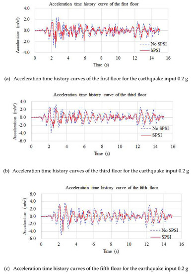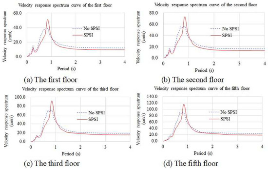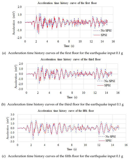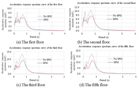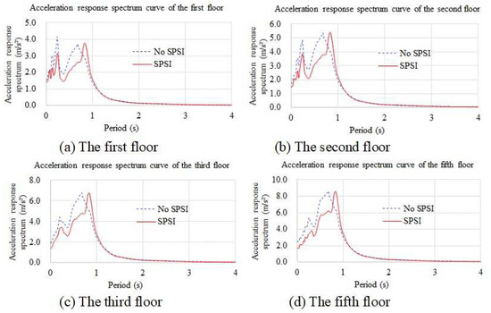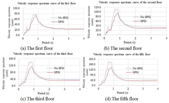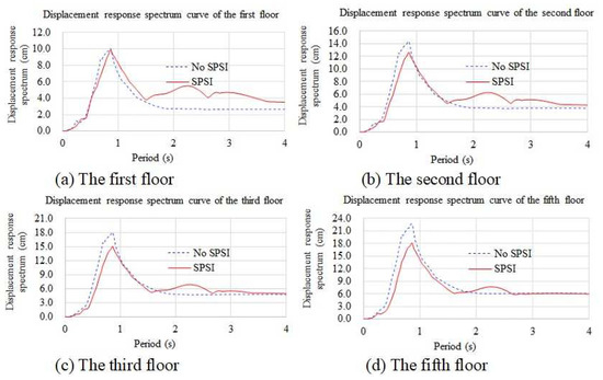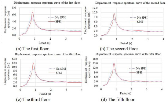 Figure 16 and Figure 17 are displacement response spectrum curves of the superstructures in the SPSI model and the No-SPSI model. When the earthquake input peak value was 0.1 g, the SPSI mainly affected the structures whose natural vibration periods ranged from 0.5 s to 1 s, and the displacement response spectrum values in the SPSI model were greater than those in the No-SPSI model. However, when the earthquake input peak value was 0.2 g, for structures with natural vibration periods less than 1.5 s, there was little difference between the displacement response spectrum values in the two models for the first and second floors. In this situation, the SPSI mainly affected structures with natural vibration periods greater than 1.5 s, and the SPSI increased the displacement response spectrum values of structures with natural vibration periods greater than 1.5 s. For structures above the third floor, the SPSI increased the influence on structures with natural vibration periods in the range of 0.5 s to 1 s and reduced the displacement response spectrum values of the superstructure.