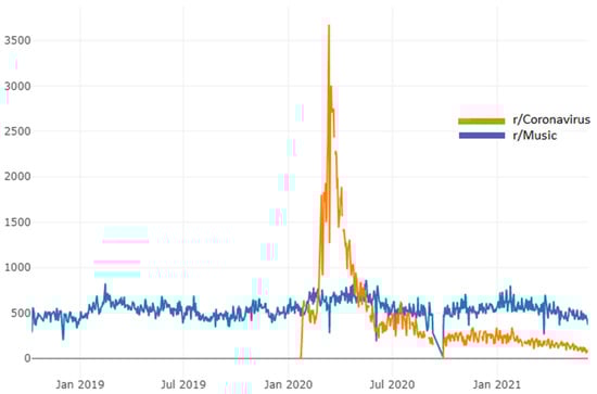 Figure 1 was extracted from subreddit stats [20], and it plots the evolution of r/Coronavirus and r/Music (from January 2019 to July 2021), showing the tremendous increase in posts per day experienced by r/Coronavirus even when compared with one of the most popular subreddits as is the case of r/Music.