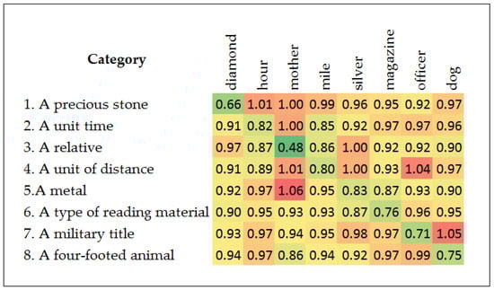 - Battig, W.F.; Montague, W.E. Category norms for verbal items in 56 categories: A replication and extension of the Connecticut norms. J. Exp. Psychol. 1969, 80, 1–46. [Google Scholar] [CrossRef]